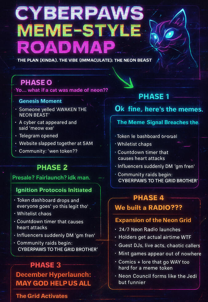 For people who discovered CyberPaws late but still want in before the hyperlaunch.💥 Fairlaunch OptionIf the community chooses chaos > structure, CyberPaws may instead launch as a pure fairlaunch — sending the Neon Grid into instant frenzy.