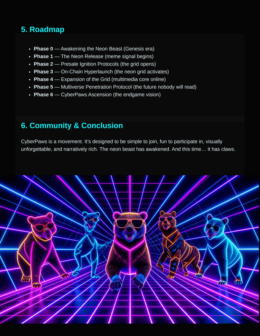 Why CyberPaws?CyberPaws isn’t just another meme coin — it’s a community-built, art-driven cyberpunk universe powered by music, NFTs, lore, and a growing army of neon feline supporters.Our vision:
