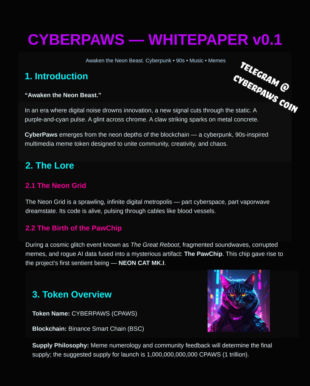 CyberPaws is a cyberpunk, 90s-inspired multimedia meme token emerging from the neon depths of the blockchain. Powered by a growing community across Telegram and X, CyberPaws blends futuristic art, music culture, and narrative world-building into a single glowing signal. Built on Binance Smart Chain, CPAWS fuses lore, creativity, and degen energy into a movement — not just another meme. With the official launch coming this December and a presale or fair-launch currently being finalized, CyberPaws is preparing to open the Neon Grid and invite early believers to take their place in the rise of the Neon Beast.Coming soon to the BSC network in December 2025!Stay early, stay neon. Be sure to join telegram @CyberPawsCoin!