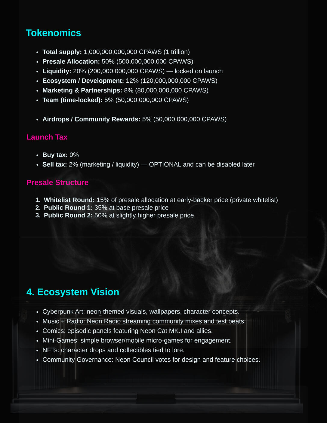 Join the Neon TribeStep into the cyberpunk alleyways of the CyberGrid and claim your place among the early founders of CyberPaws (CPAWS) — the meme-powered neon feline taking over the blockchain underground.Early backers get: